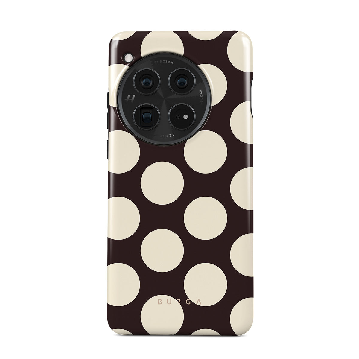 Este design contém: grandes bolinhas creme sobre fundo escuro.