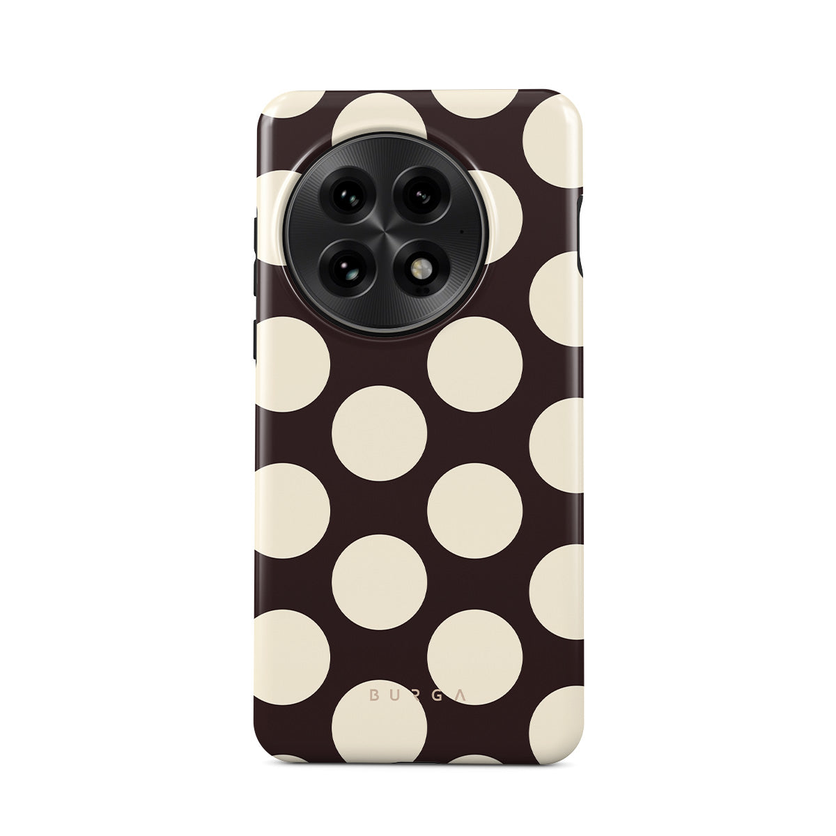 Este design contém: grandes bolinhas creme sobre fundo escuro.