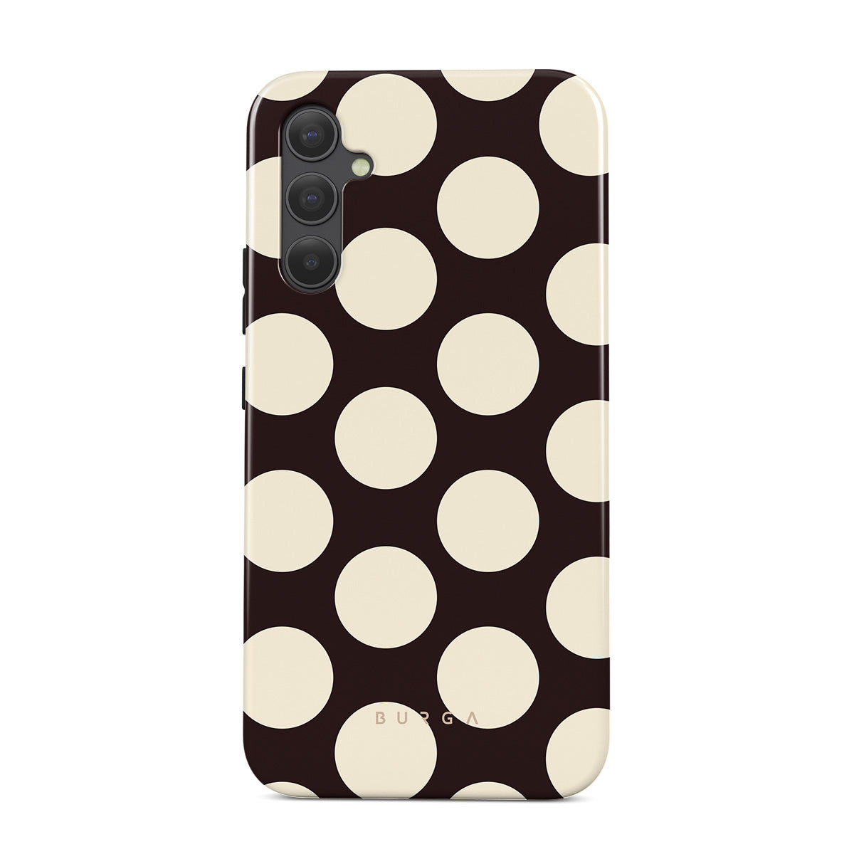 Este design contém: grandes bolinhas creme sobre fundo escuro.