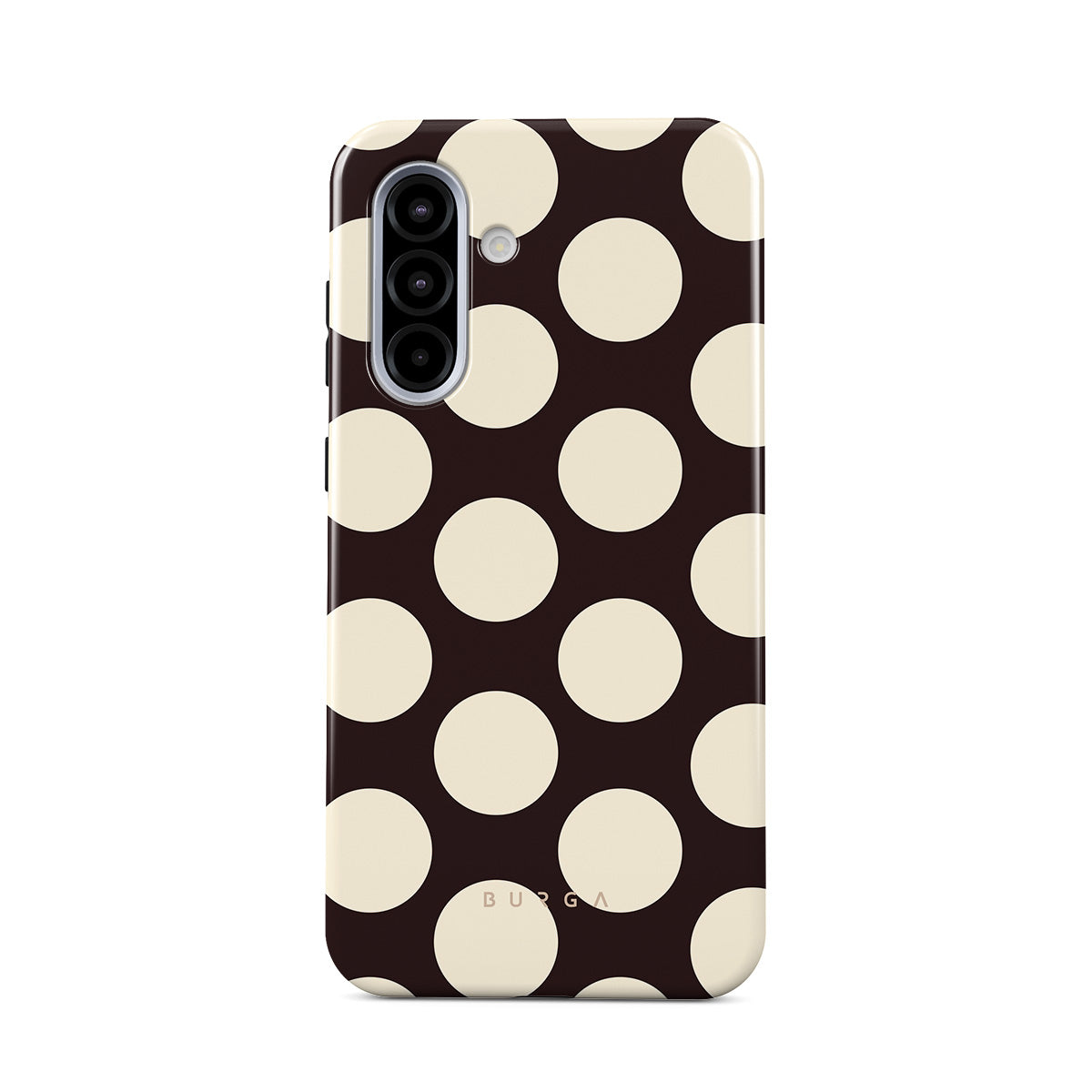Este design contém: grandes bolinhas creme sobre fundo escuro.