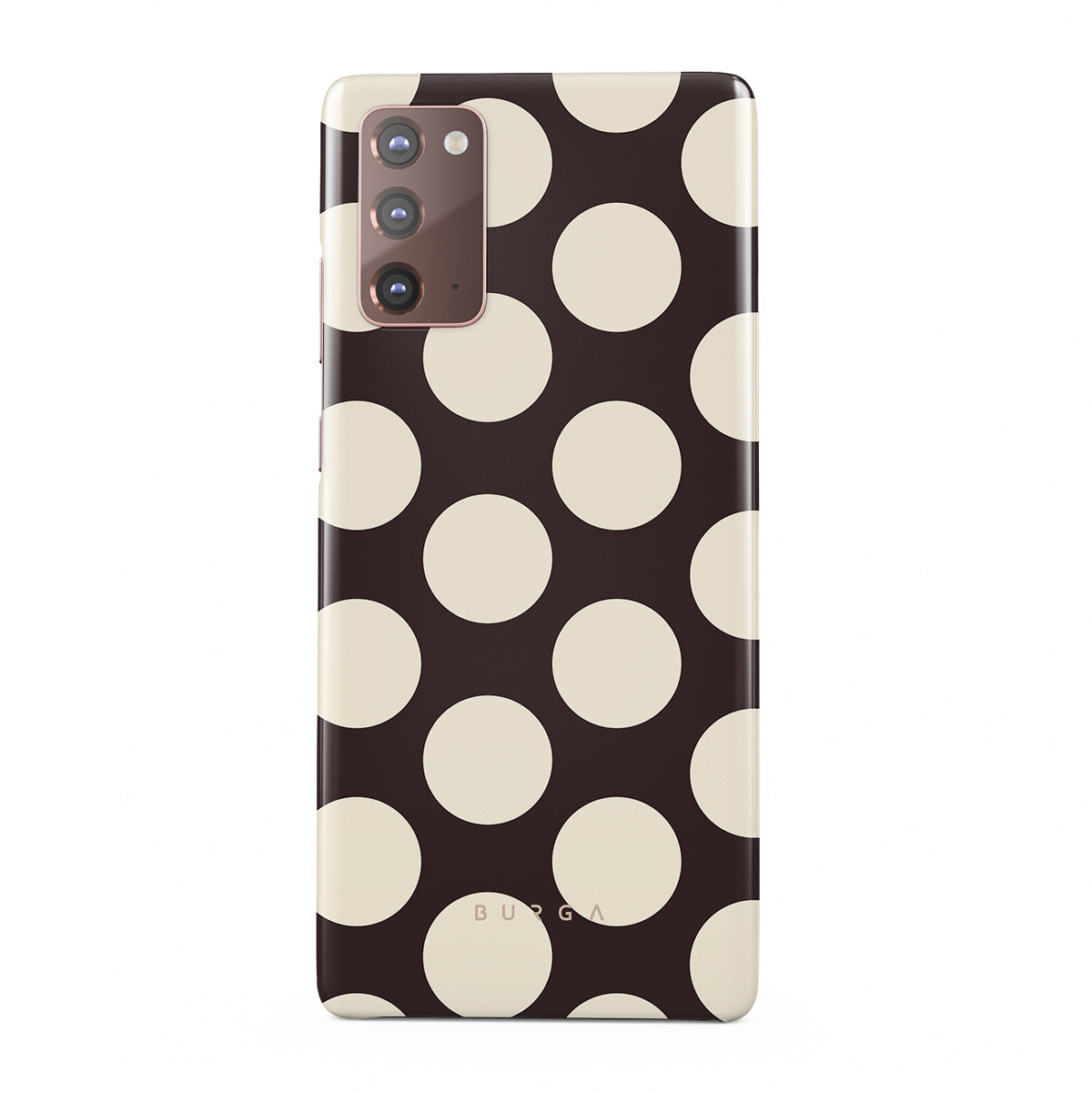 Este design contém: grandes bolinhas creme sobre fundo escuro.