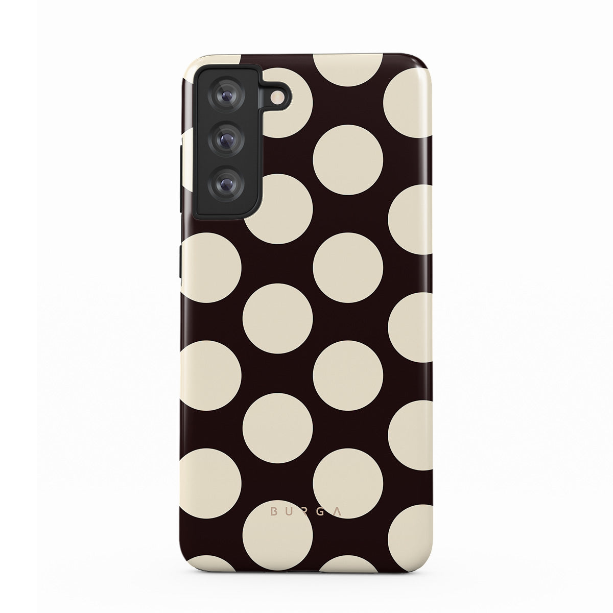 Este design contém: grandes bolinhas creme sobre fundo escuro.