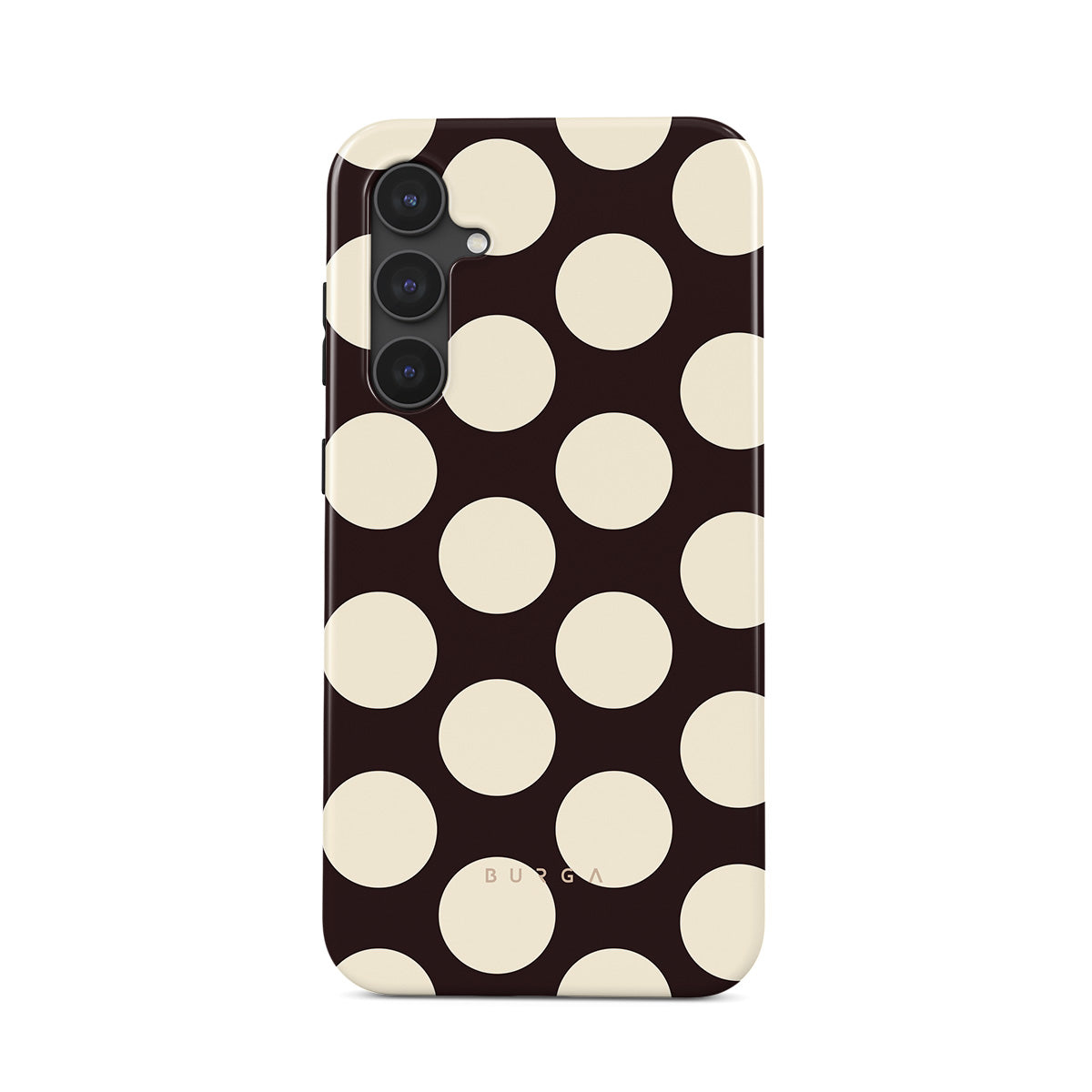 Este design contém: grandes bolinhas creme sobre fundo escuro.