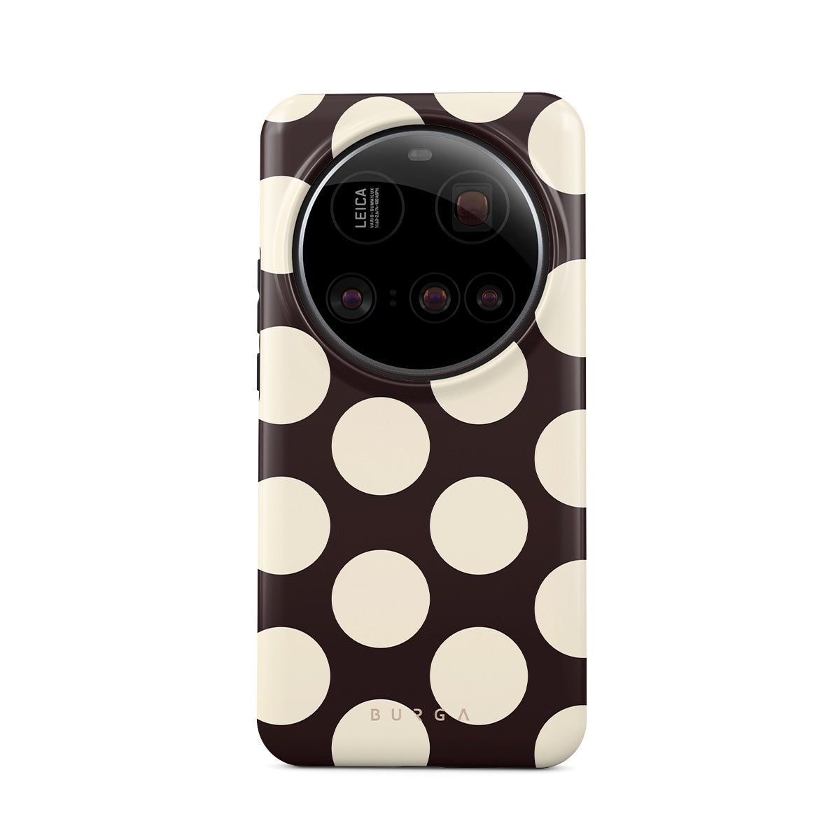 Este design contém: grandes bolinhas creme sobre fundo escuro.