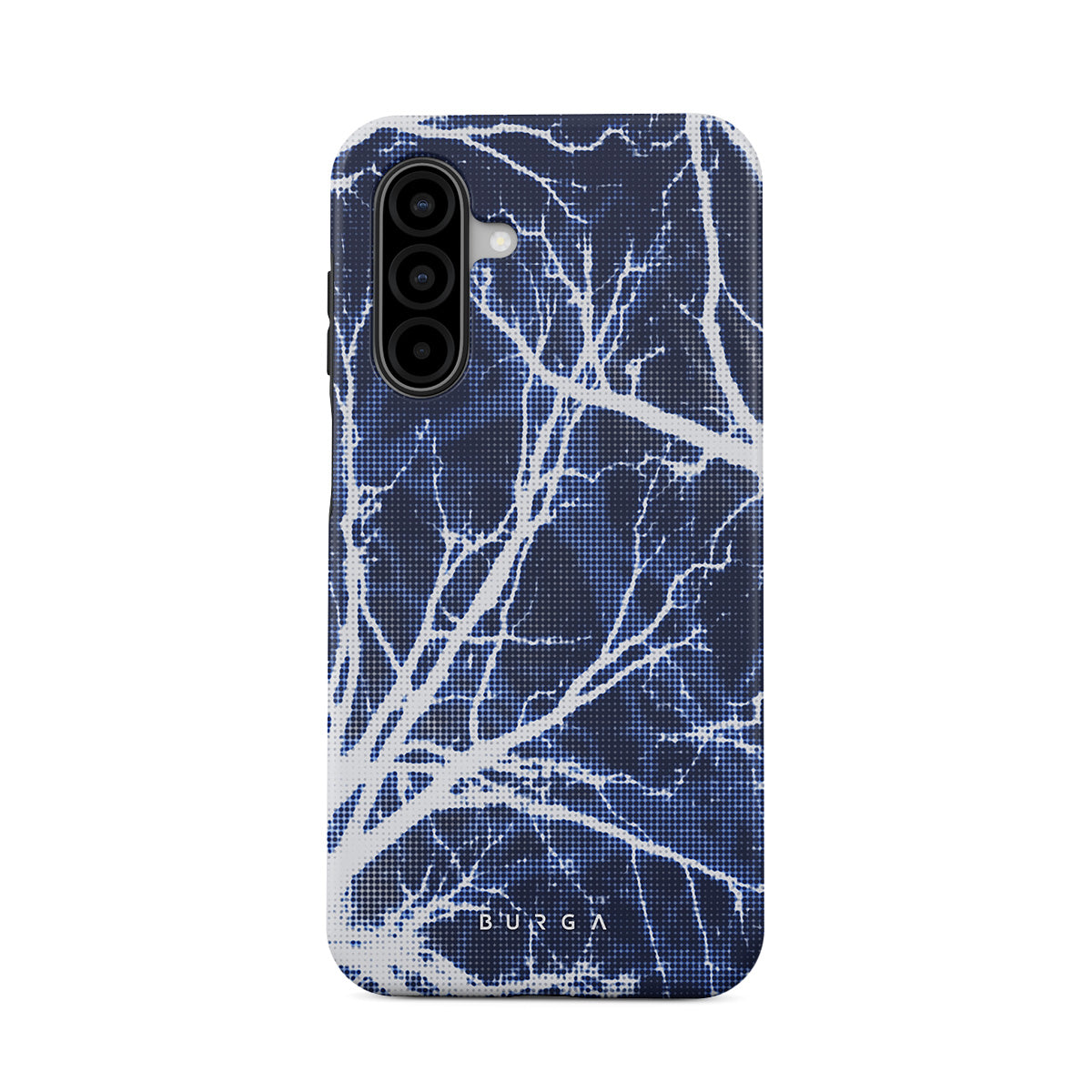 Este design contém: azul, galhos de árvores, natureza, padrão geométrico, minimalista