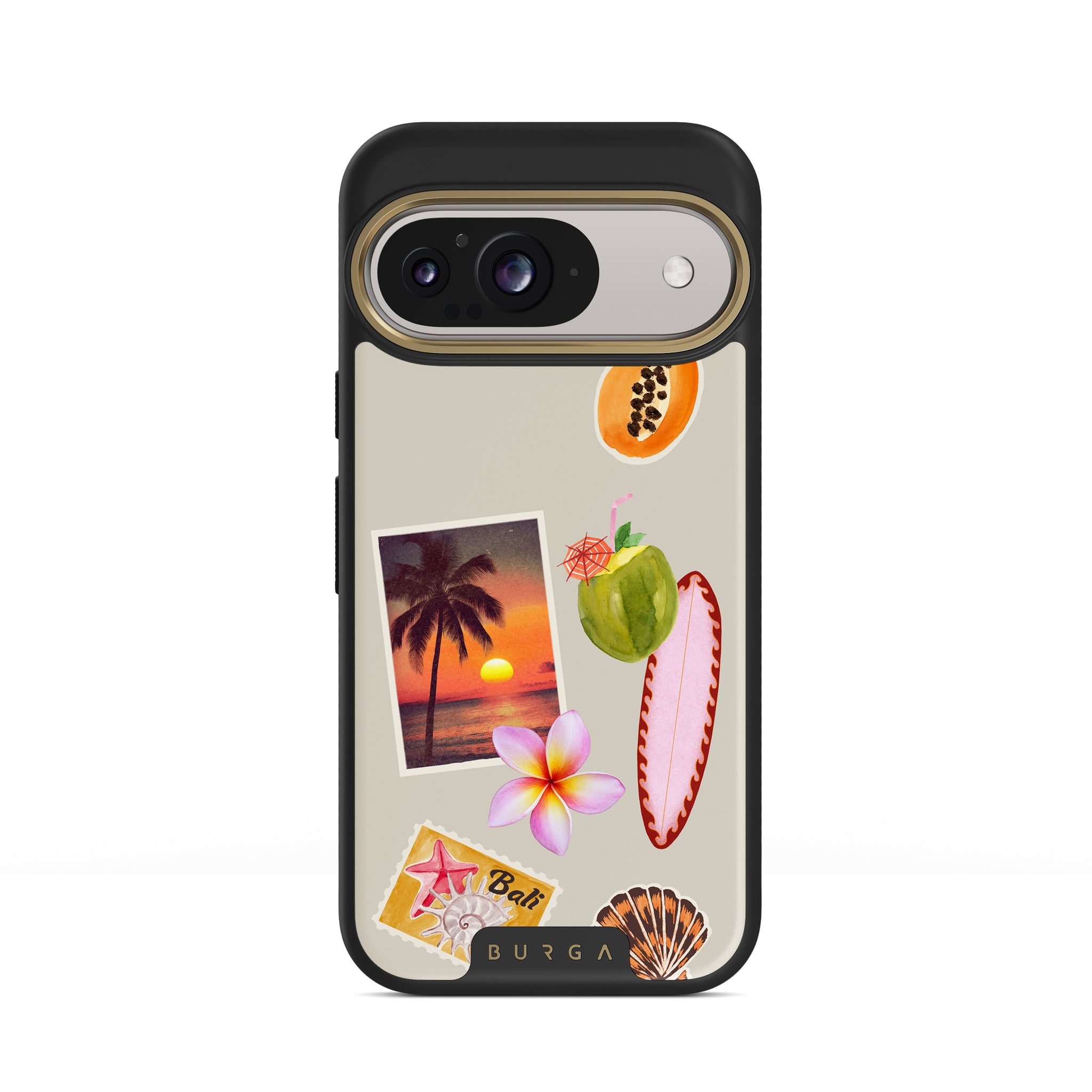 Este design contém: foto de pôr do sol tropical, papaia, coco verde, prancha de surf rosa, flor de plumeria rosa, concha laranja, postal de Bali.