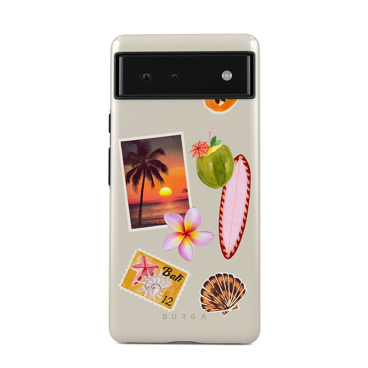 Este design contém: foto de pôr do sol tropical, papaia, coco verde, prancha de surf rosa, flor de plumeria rosa, concha laranja, postal de Bali.