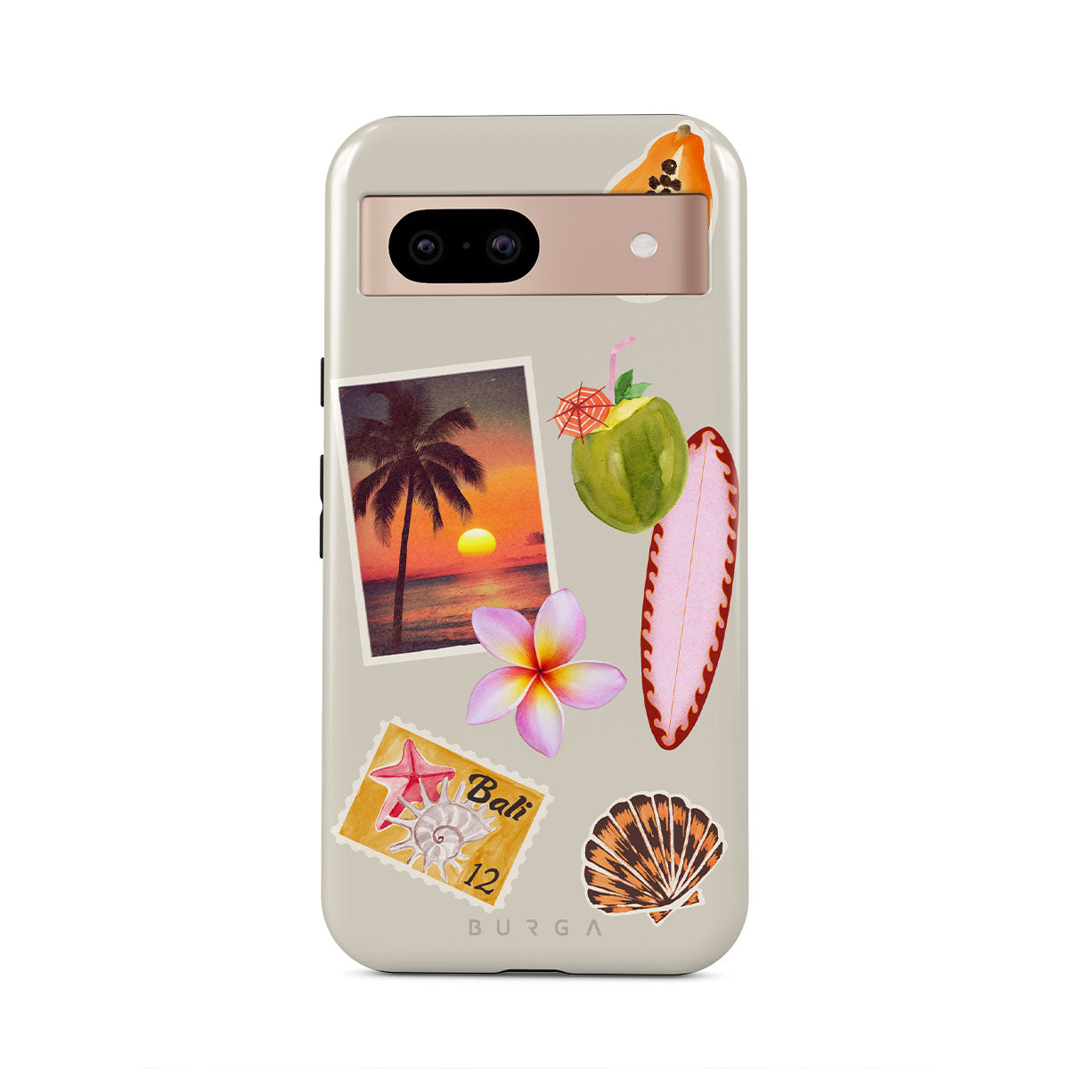 Este design contém: foto de pôr do sol tropical, papaia, coco verde, prancha de surf rosa, flor de plumeria rosa, concha laranja, postal de Bali.