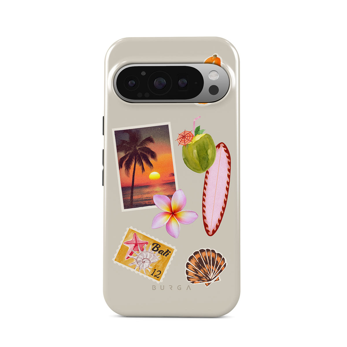 Este design contém: foto de pôr do sol tropical, papaia, coco verde, prancha de surf rosa, flor de plumeria rosa, concha laranja, postal de Bali.