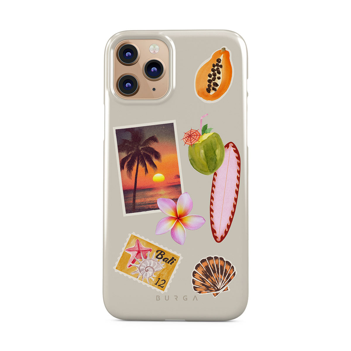 Este design contém: foto de pôr do sol tropical, papaia, coco verde, prancha de surf rosa, flor de plumeria rosa, concha laranja, postal de Bali.