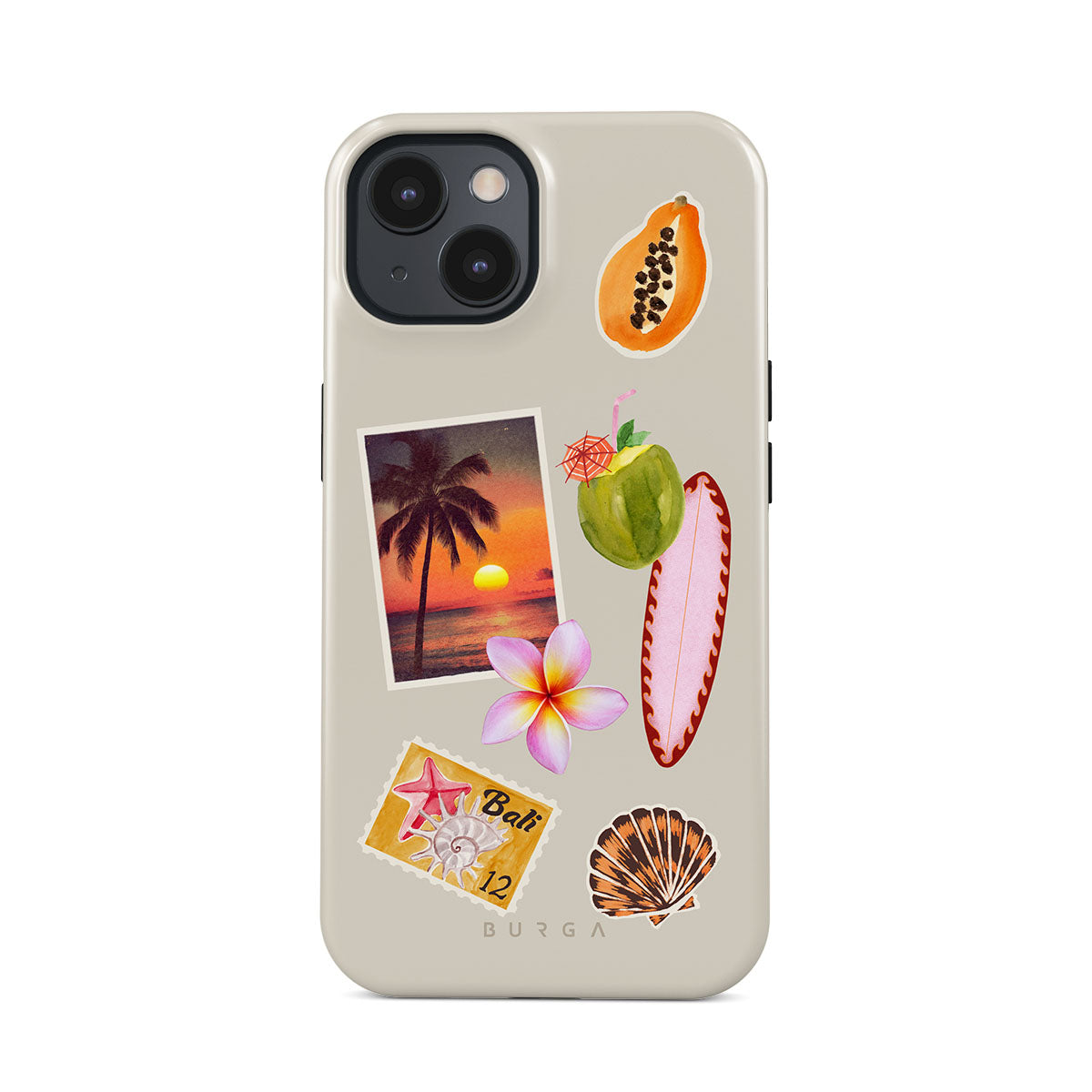 Este design contém: foto de pôr do sol tropical, papaia, coco verde, prancha de surf rosa, flor de plumeria rosa, concha laranja, postal de Bali.