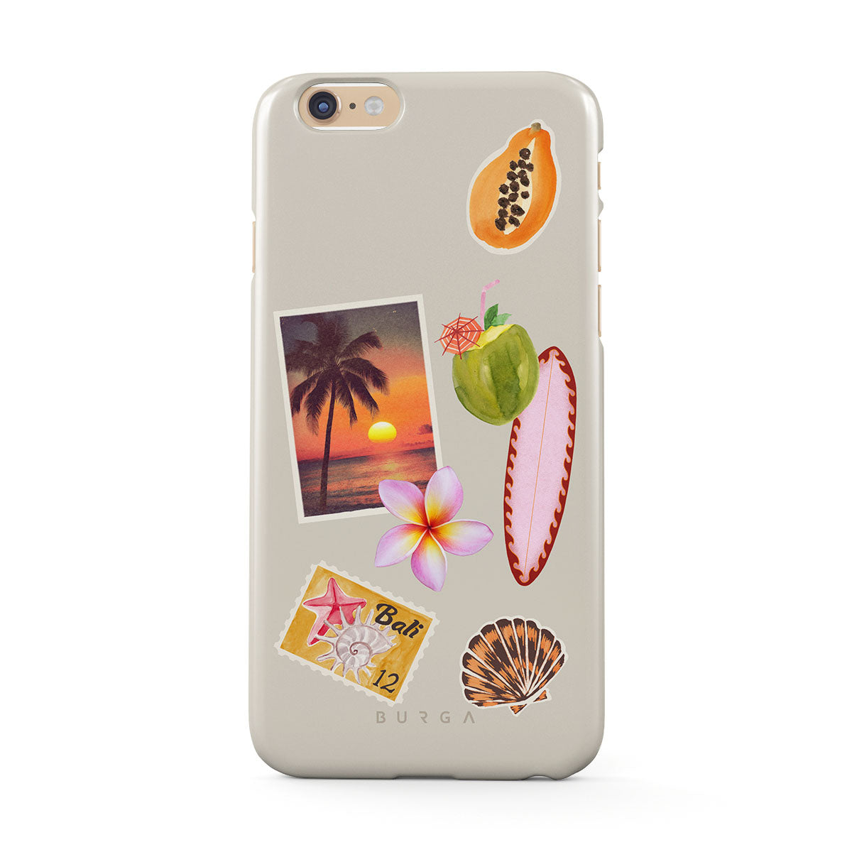 Este design contém: foto de pôr do sol tropical, papaia, coco verde, prancha de surf rosa, flor de plumeria rosa, concha laranja, postal de Bali.