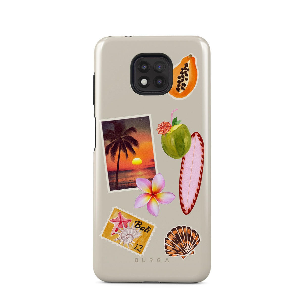 Este design contém: foto de pôr do sol tropical, papaia, coco verde, prancha de surf rosa, flor de plumeria rosa, concha laranja, postal de Bali.