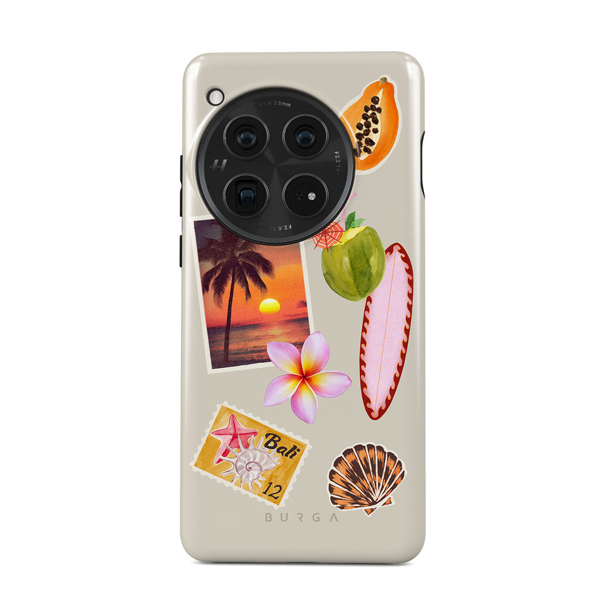 Este design contém: foto de pôr do sol tropical, papaia, coco verde, prancha de surf rosa, flor de plumeria rosa, concha laranja, postal de Bali.