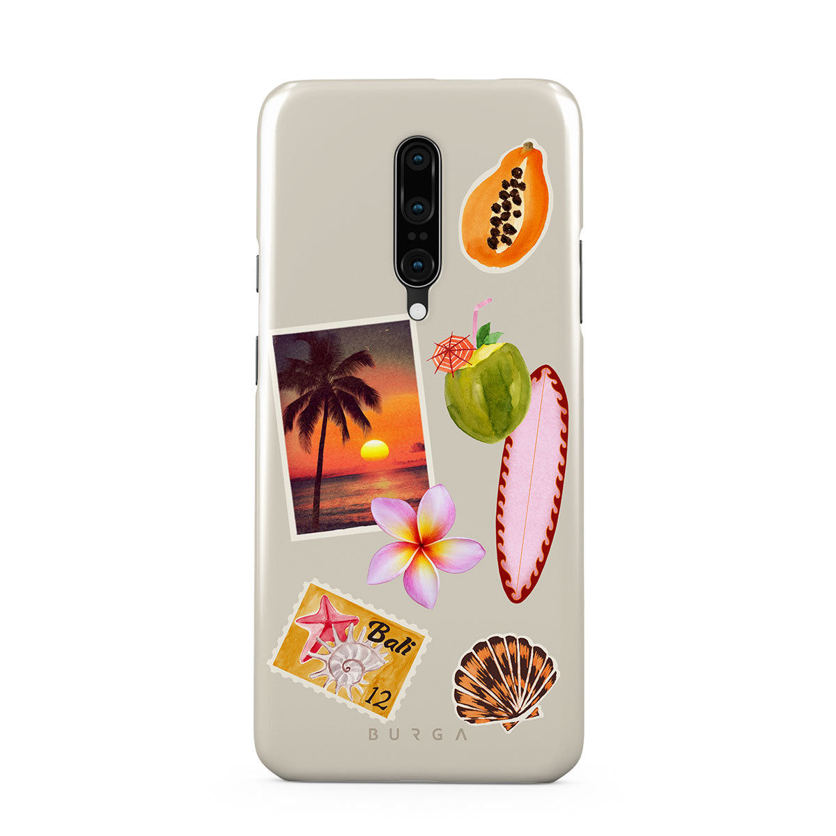 Este design contém: foto de pôr do sol tropical, papaia, coco verde, prancha de surf rosa, flor de plumeria rosa, concha laranja, postal de Bali.