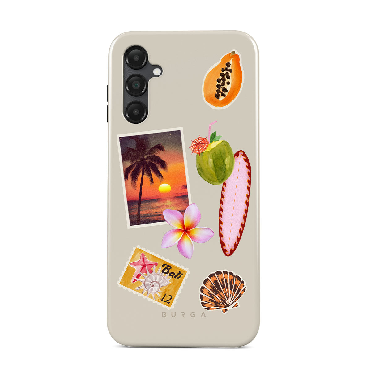 Este design contém: foto de pôr do sol tropical, papaia, coco verde, prancha de surf rosa, flor de plumeria rosa, concha laranja, postal de Bali.