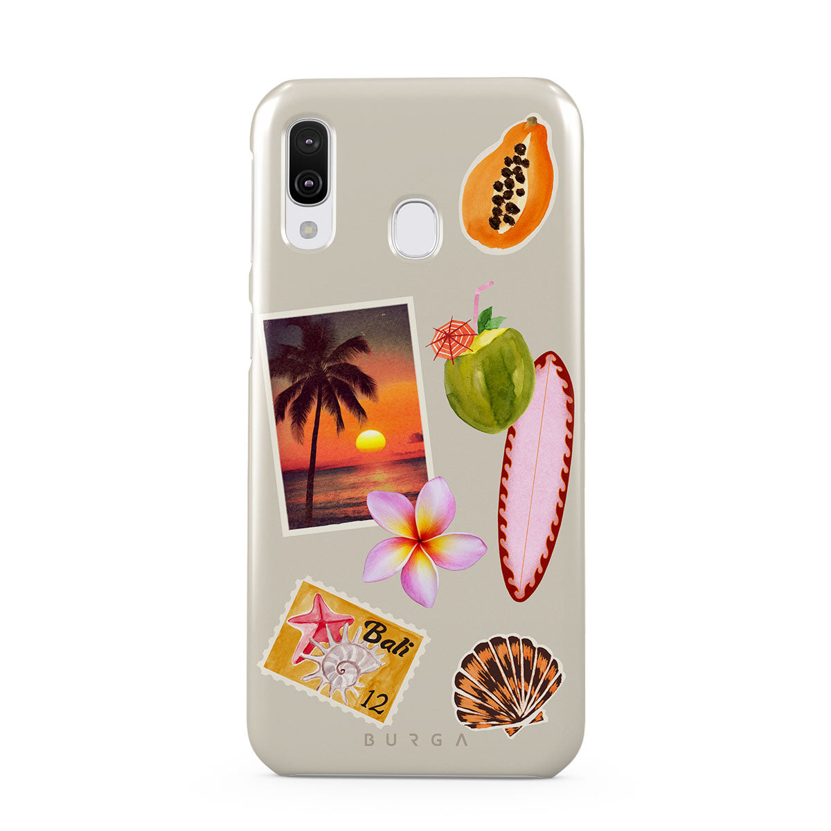 Este design contém: foto de pôr do sol tropical, papaia, coco verde, prancha de surf rosa, flor de plumeria rosa, concha laranja, postal de Bali.