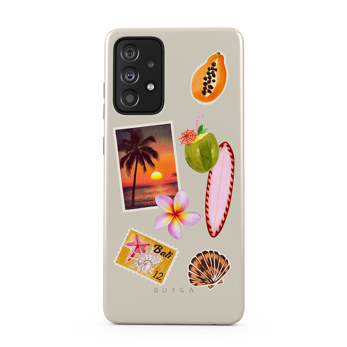 Este design contém: foto de pôr do sol tropical, papaia, coco verde, prancha de surf rosa, flor de plumeria rosa, concha laranja, postal de Bali.