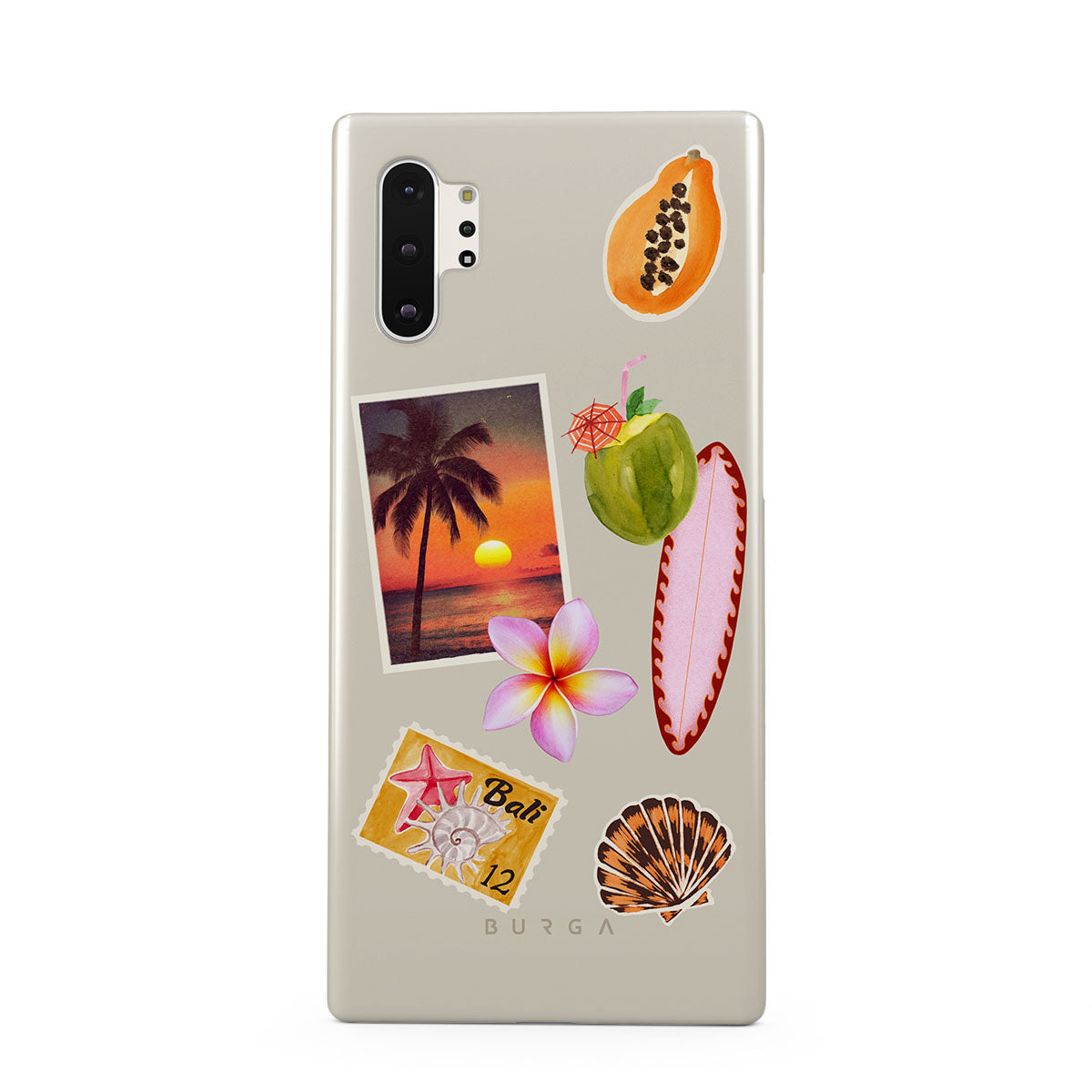 Este design contém: foto de pôr do sol tropical, papaia, coco verde, prancha de surf rosa, flor de plumeria rosa, concha laranja, postal de Bali.