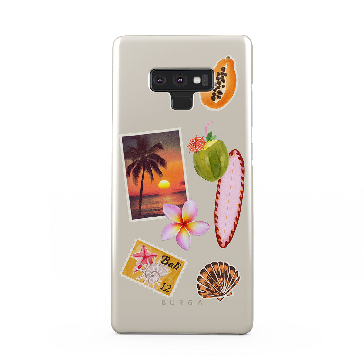 Este design contém: foto de pôr do sol tropical, papaia, coco verde, prancha de surf rosa, flor de plumeria rosa, concha laranja, postal de Bali.