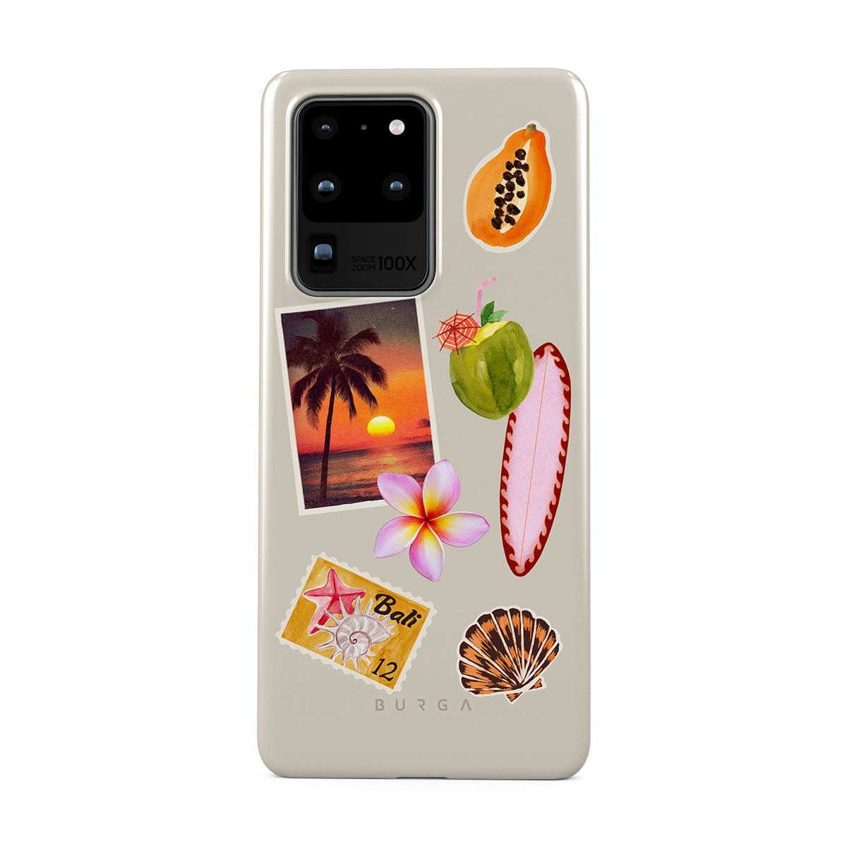 Este design contém: foto de pôr do sol tropical, papaia, coco verde, prancha de surf rosa, flor de plumeria rosa, concha laranja, postal de Bali.
