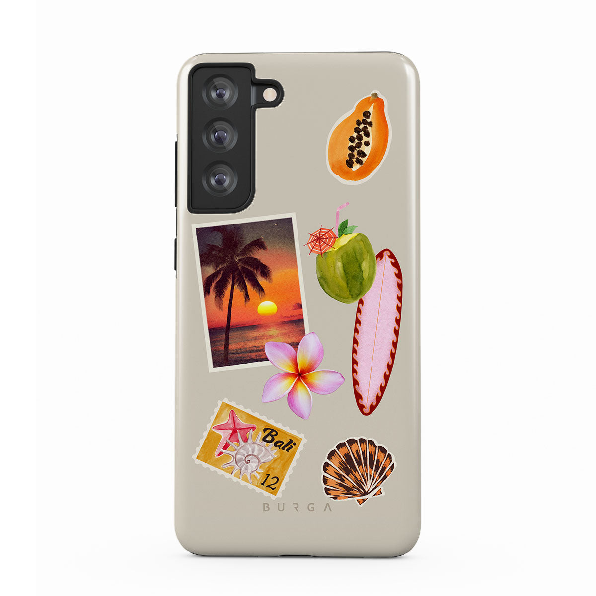 Este design contém: foto de pôr do sol tropical, papaia, coco verde, prancha de surf rosa, flor de plumeria rosa, concha laranja, postal de Bali.