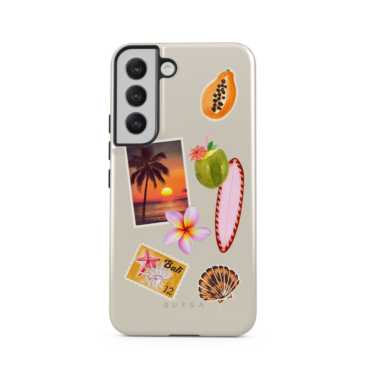 Este design contém: foto de pôr do sol tropical, papaia, coco verde, prancha de surf rosa, flor de plumeria rosa, concha laranja, postal de Bali.