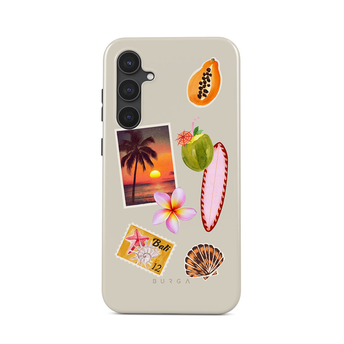 Este design contém: foto de pôr do sol tropical, papaia, coco verde, prancha de surf rosa, flor de plumeria rosa, concha laranja, postal de Bali.
