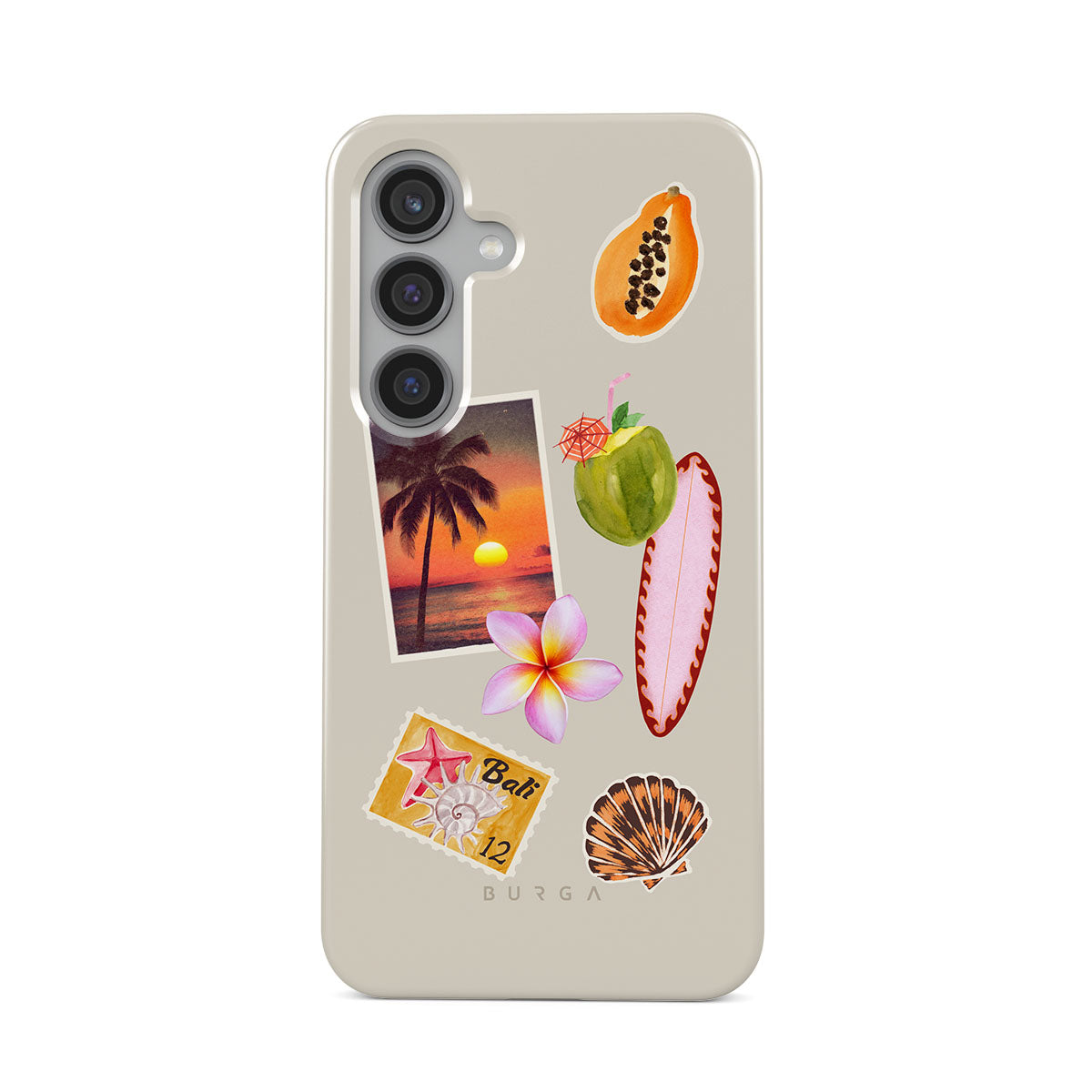 Este design contém: foto de pôr do sol tropical, papaia, coco verde, prancha de surf rosa, flor de plumeria rosa, concha laranja, postal de Bali.