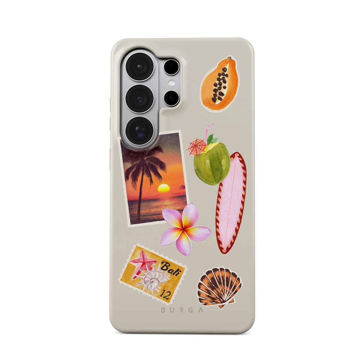 Este design contém: foto de pôr do sol tropical, papaia, coco verde, prancha de surf rosa, flor de plumeria rosa, concha laranja, postal de Bali.