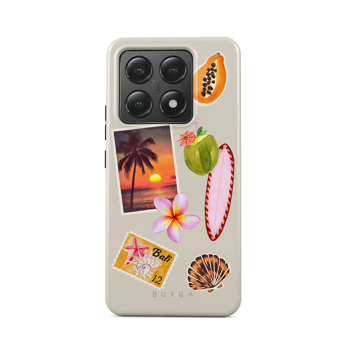 Este design contém: foto de pôr do sol tropical, papaia, coco verde, prancha de surf rosa, flor de plumeria rosa, concha laranja, postal de Bali.
