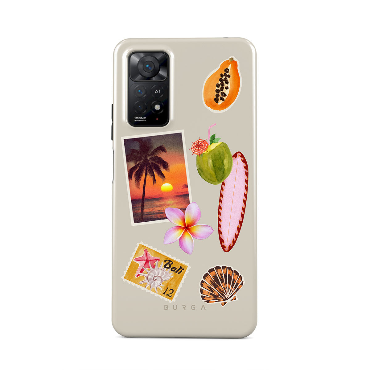 Este design contém: foto de pôr do sol tropical, papaia, coco verde, prancha de surf rosa, flor de plumeria rosa, concha laranja, postal de Bali.