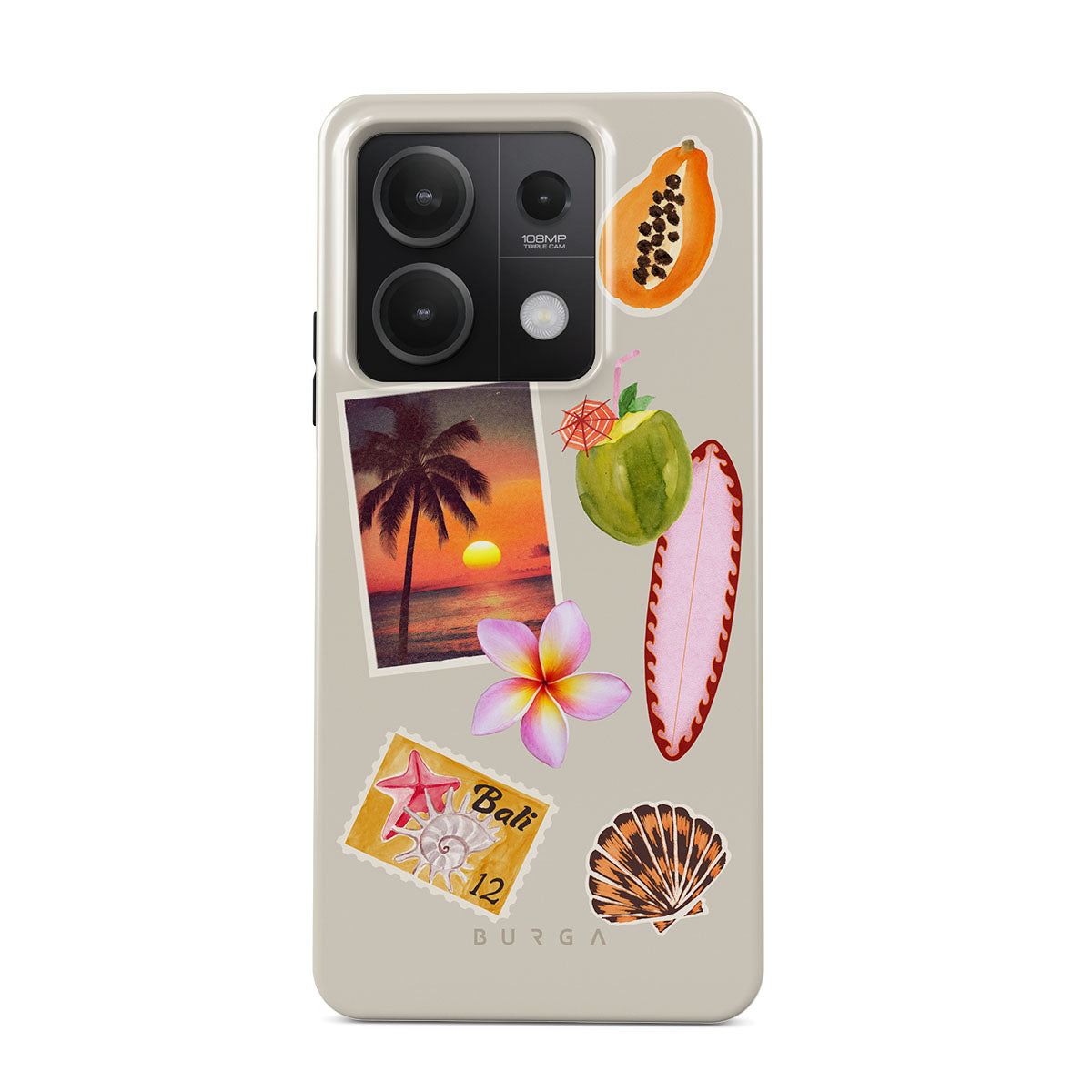Este design contém: foto de pôr do sol tropical, papaia, coco verde, prancha de surf rosa, flor de plumeria rosa, concha laranja, postal de Bali.