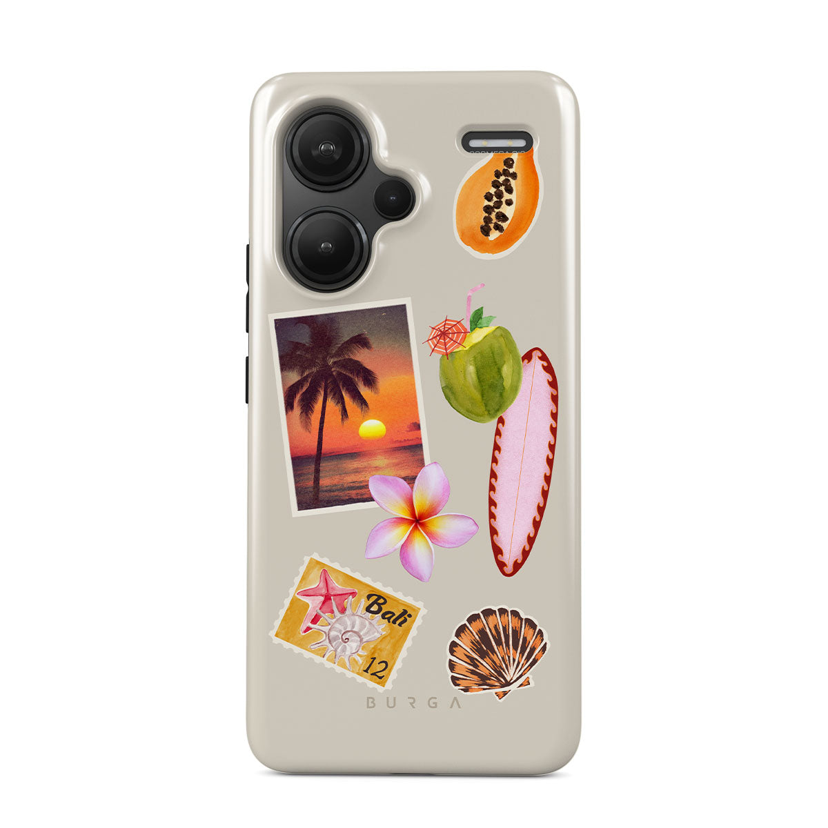 Este design contém: foto de pôr do sol tropical, papaia, coco verde, prancha de surf rosa, flor de plumeria rosa, concha laranja, postal de Bali.