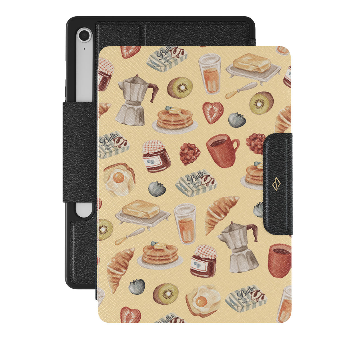 Este design contém: comida de pequeno-almoço, panquecas, compota, ovos, manteiga, café, doces, frutas, sumo de laranja, croissant