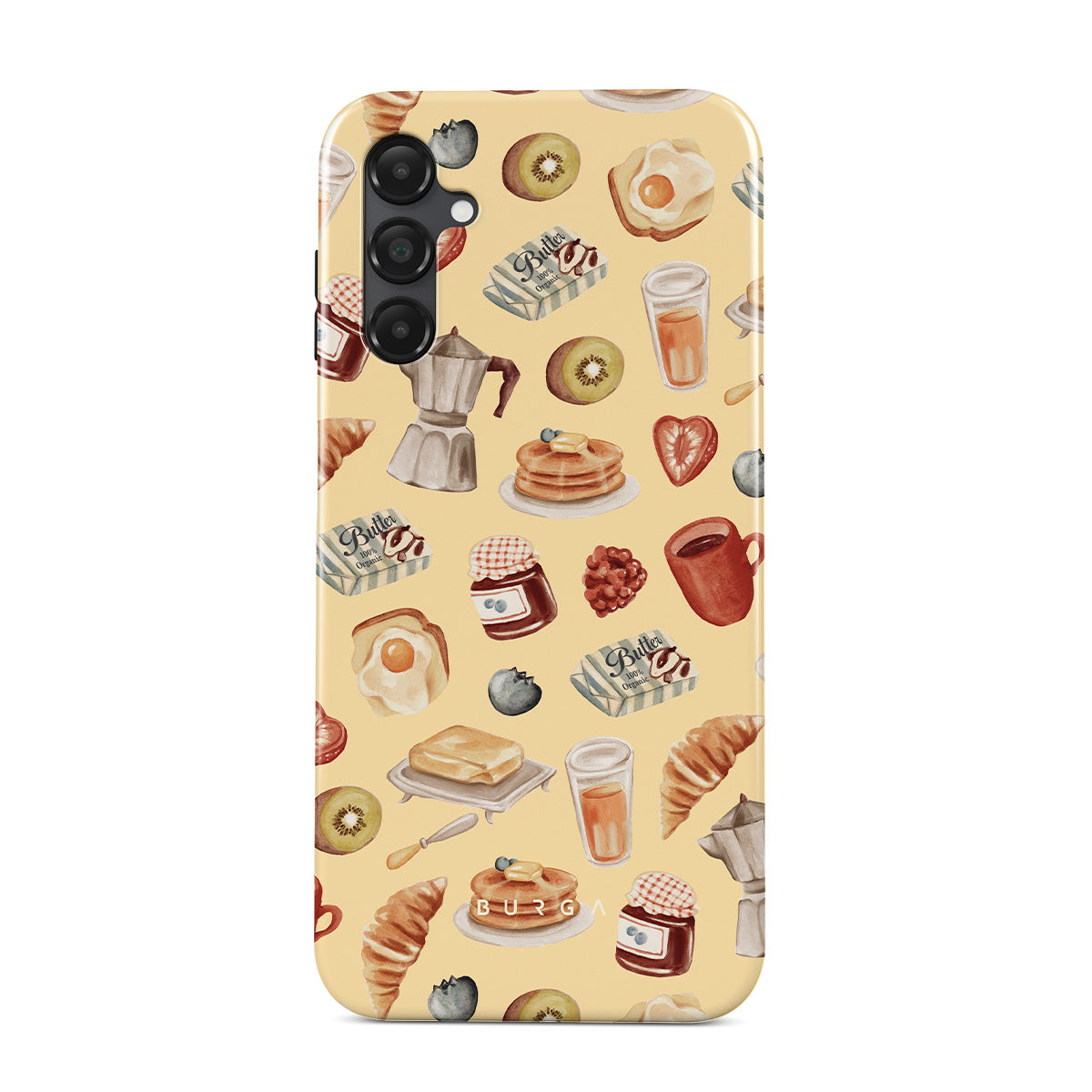Este design contém: comida de pequeno-almoço, panquecas, compota, ovos, manteiga, café, doces, frutas, sumo de laranja, croissant