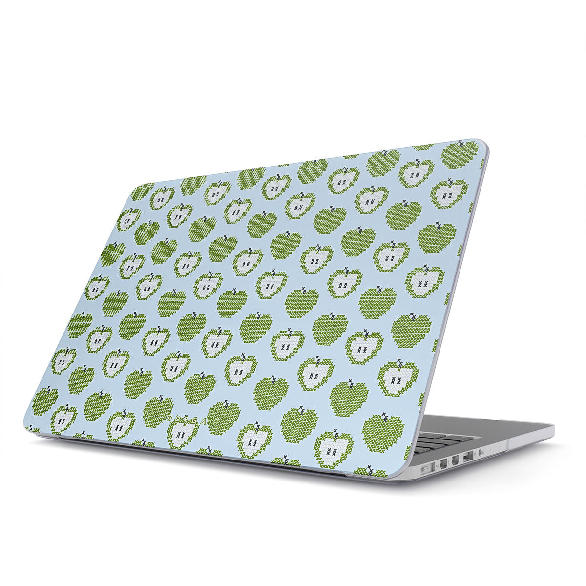 Este design contém: maçãs verdes, frutas mordidas, padrões com imagens de frutas