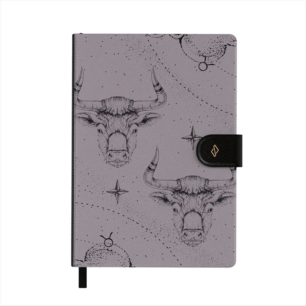 Apresenta padrões BURGA bem detalhados numa capa em pele sintética vegana, com um elegante marcador de páginas em fita preta.