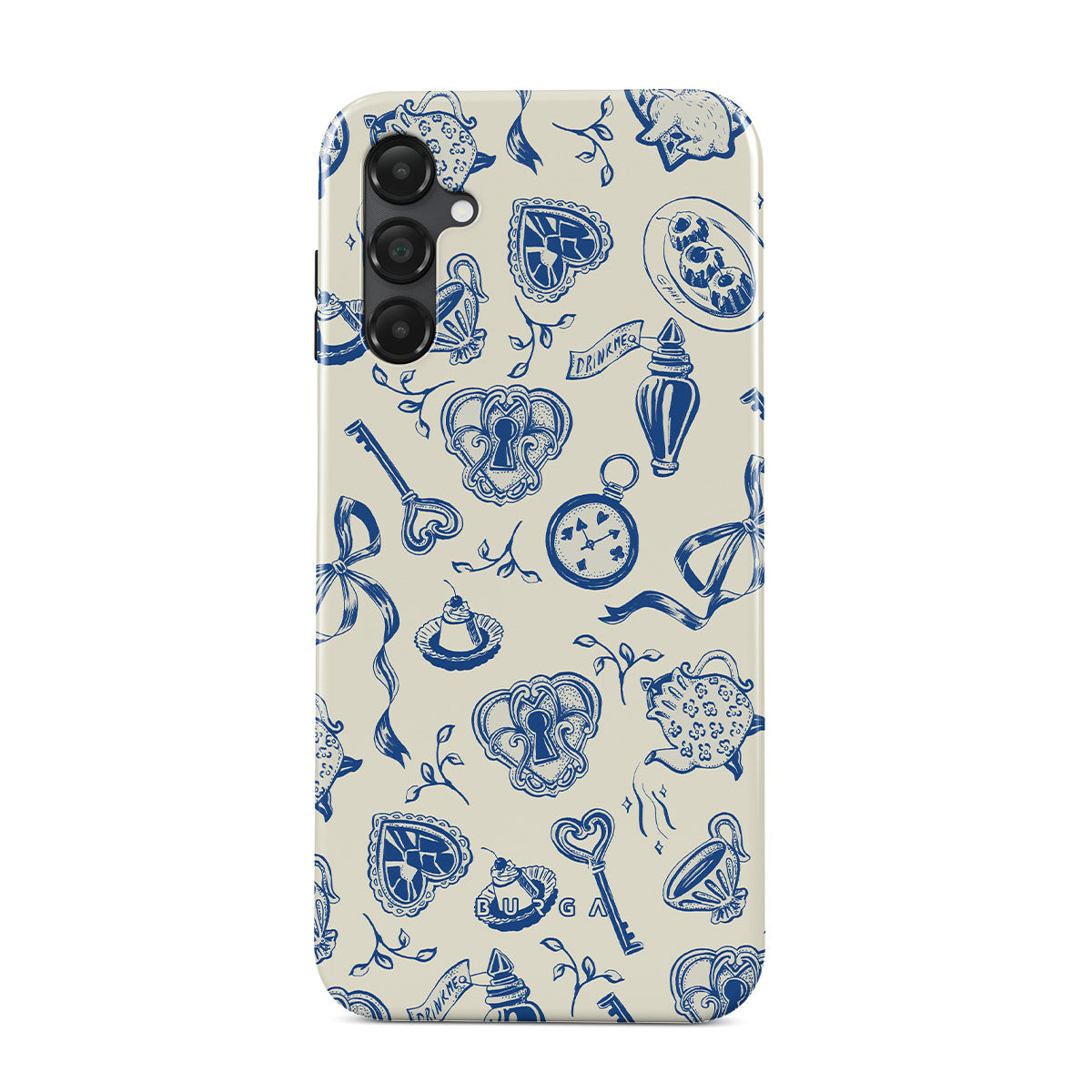 Este design contém: chávenas de chá, bules, relógios de bolso, chave, corações, cerâmica, padrão azul e branco