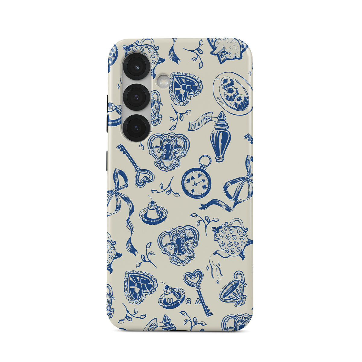 Este design contém: chávenas de chá, bules, relógios de bolso, chave, corações, cerâmica, padrão azul e branco
