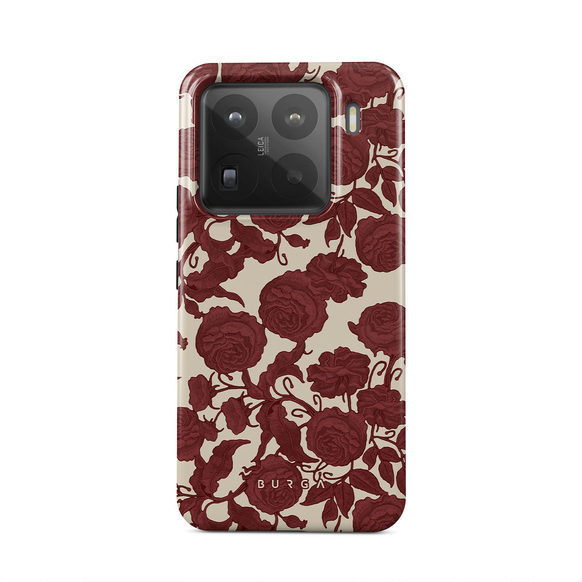 Este design contém: rosas vermelhas escuras, padrão floral intrincado, padrão vintage.