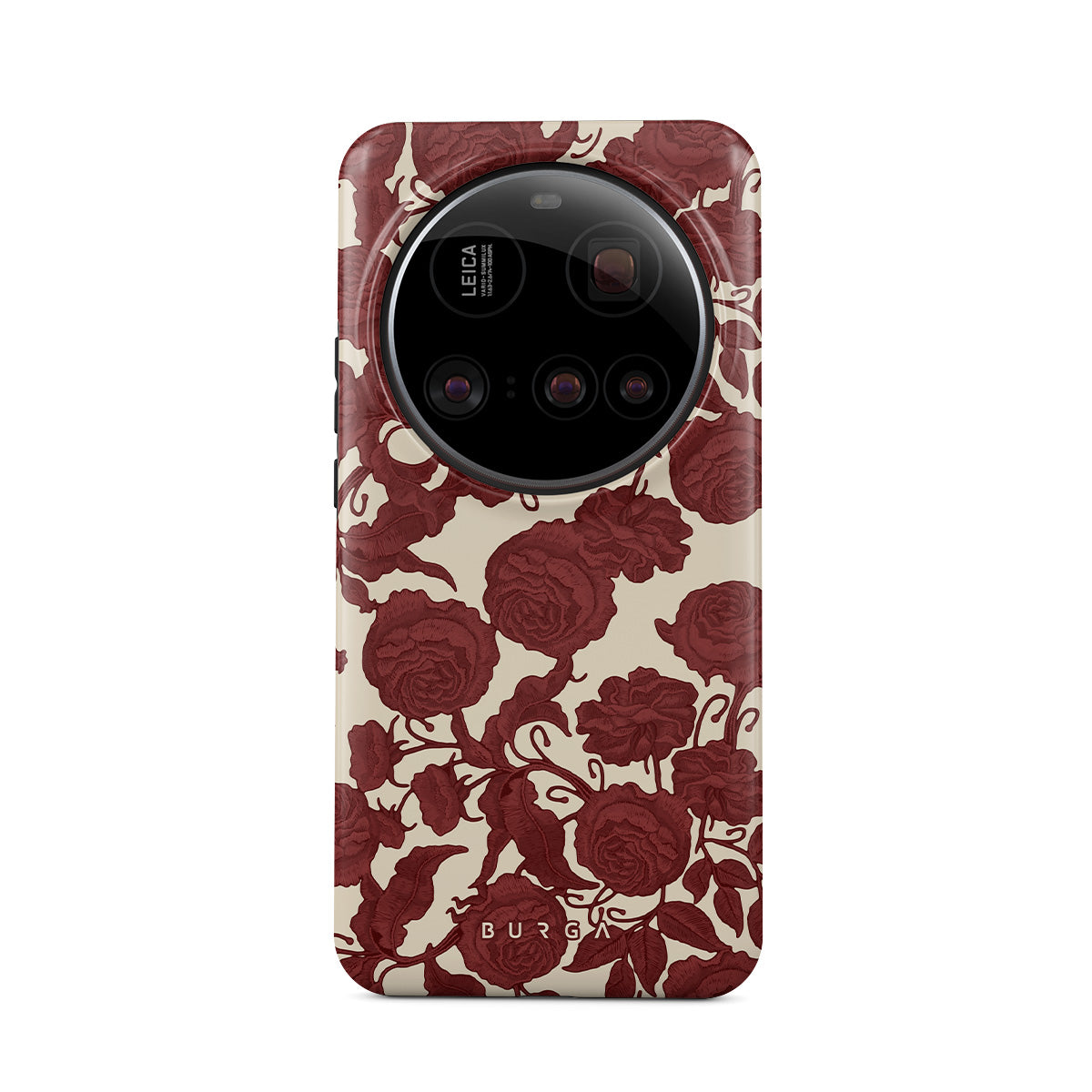 Este design contém: rosas vermelhas escuras, padrão floral intrincado, padrão vintage.