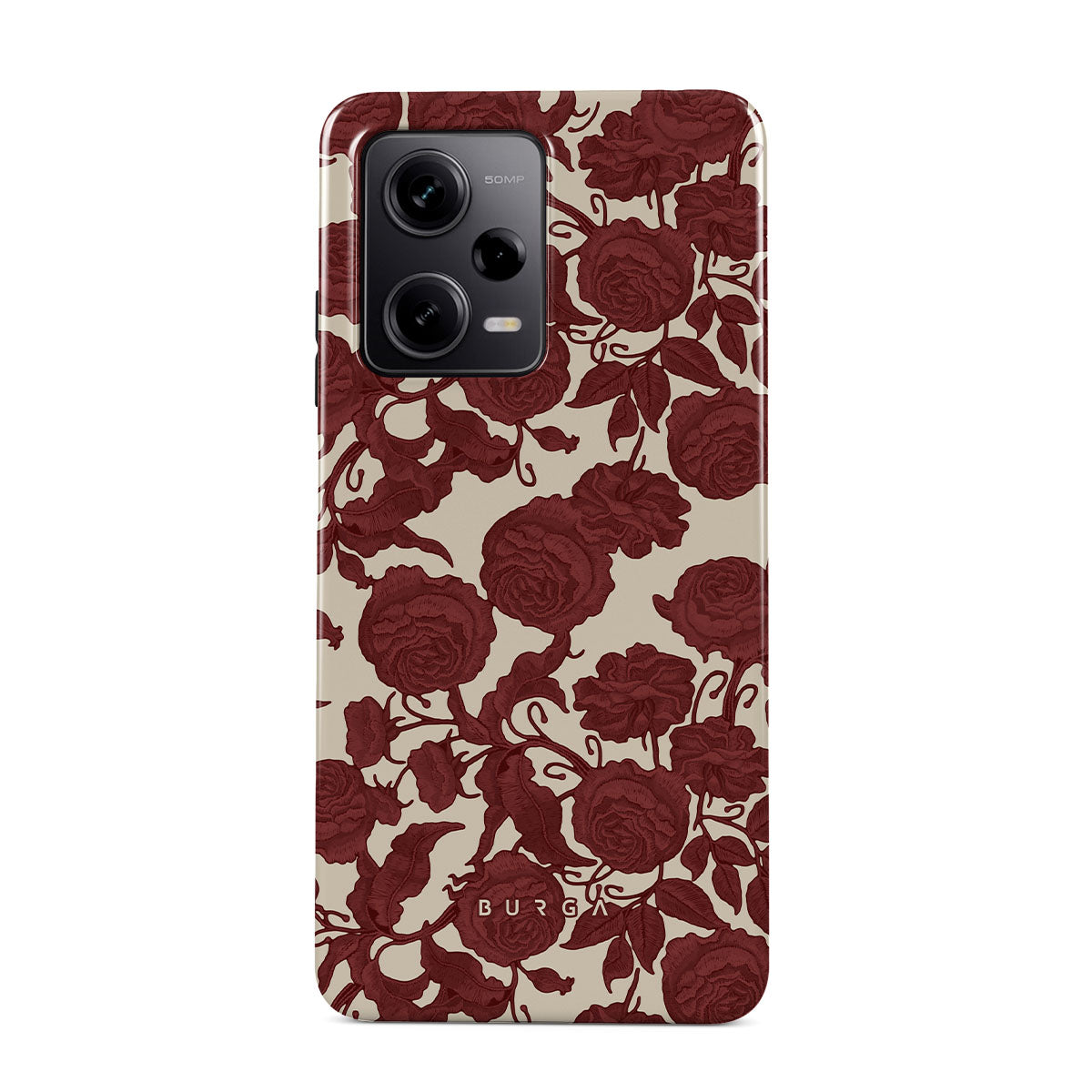 Este design contém: rosas vermelhas escuras, padrão floral intrincado, padrão vintage.