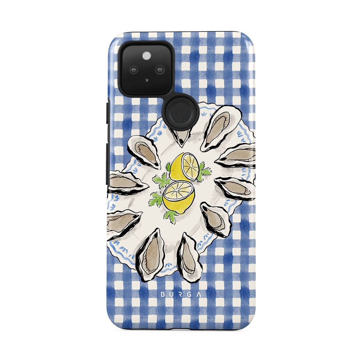Este design contém:Ostras, limão, padrão xadrez azul, elementos costeiros frescos, tons suaves pastel.