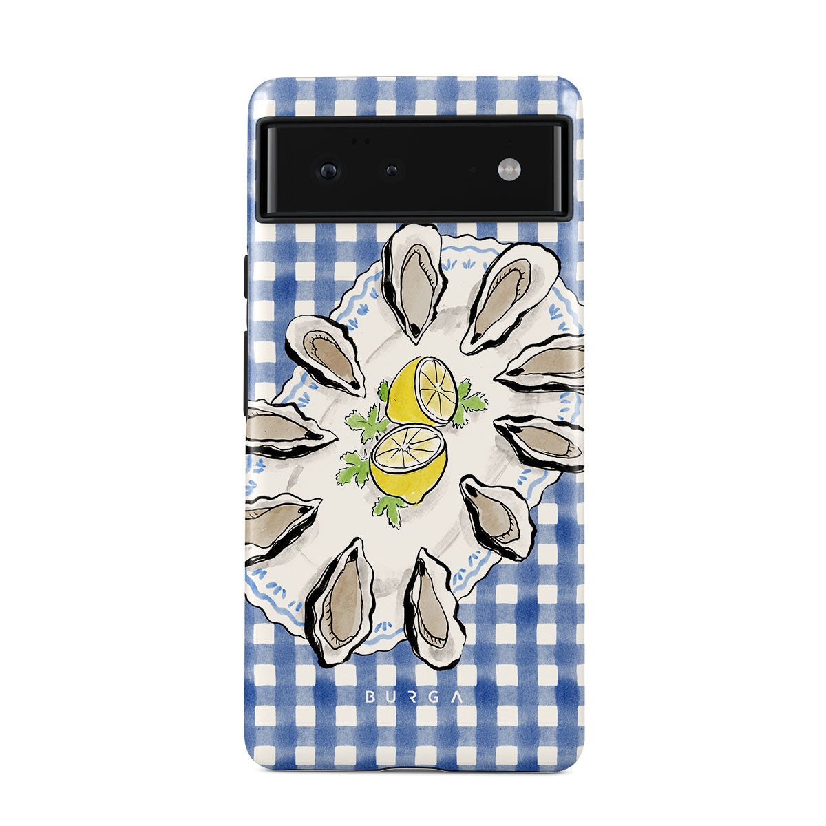 Este design contém:Ostras, limão, padrão xadrez azul, elementos costeiros frescos, tons suaves pastel.