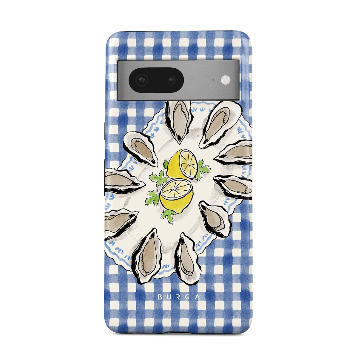 Este design contém:Ostras, limão, padrão xadrez azul, elementos costeiros frescos, tons suaves pastel.