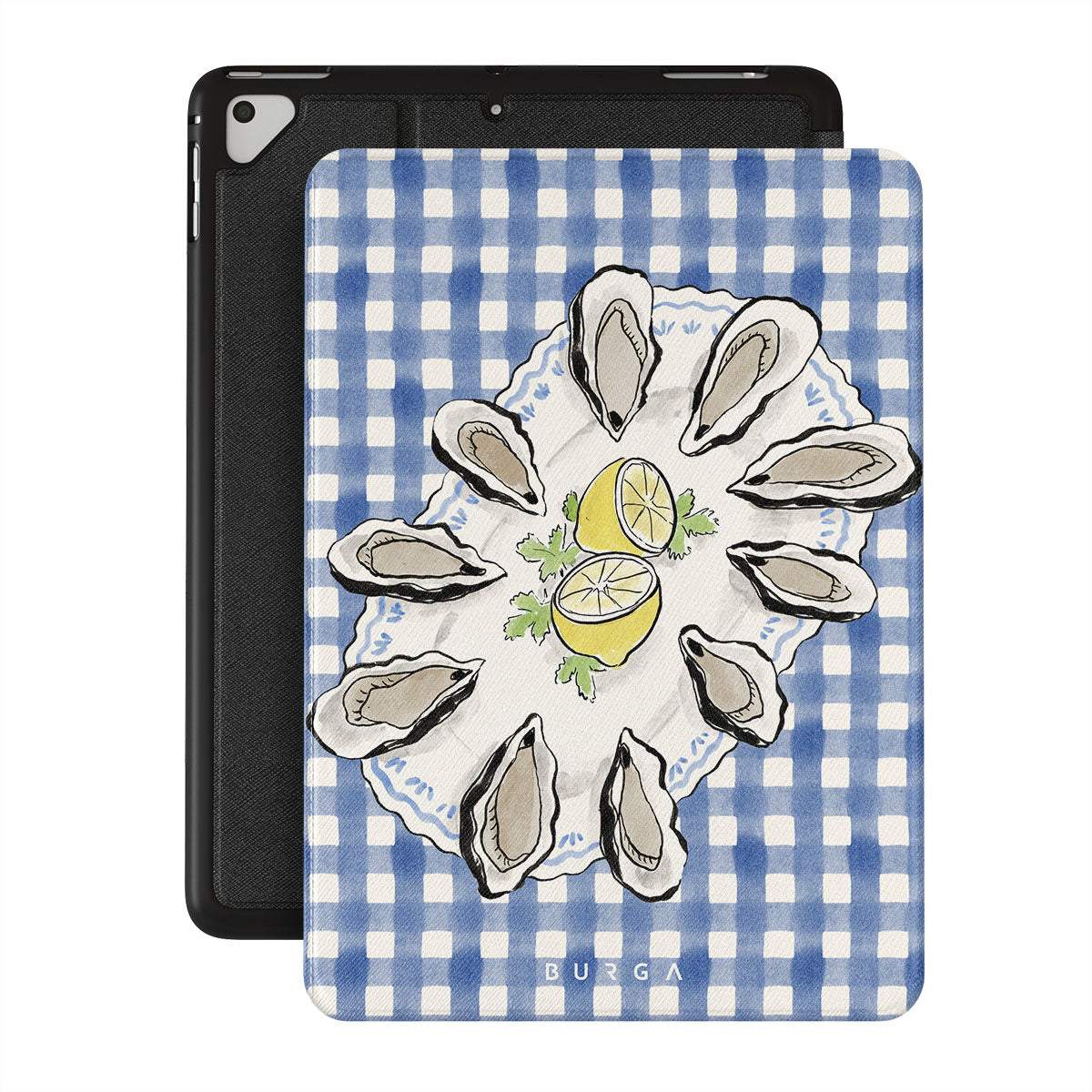 Este design contém:Ostras, limão, padrão xadrez azul, elementos costeiros frescos, tons suaves pastel.
