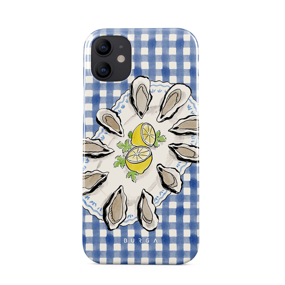 Este design contém:Ostras, limão, padrão xadrez azul, elementos costeiros frescos, tons suaves pastel.