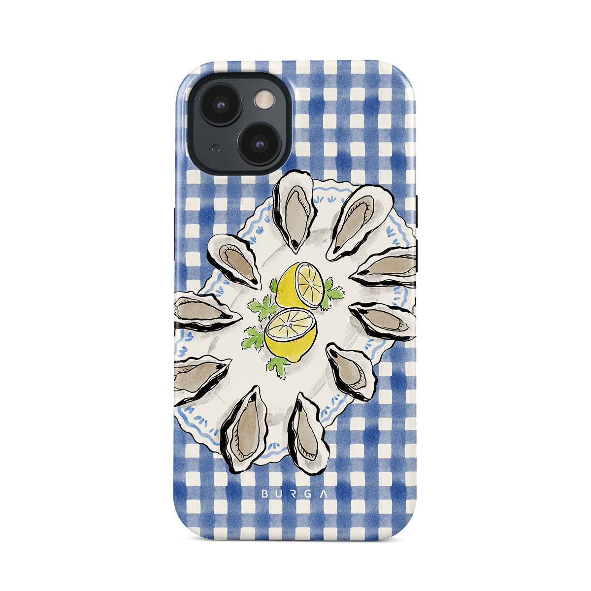 Este design contém:Ostras, limão, padrão xadrez azul, elementos costeiros frescos, tons suaves pastel.