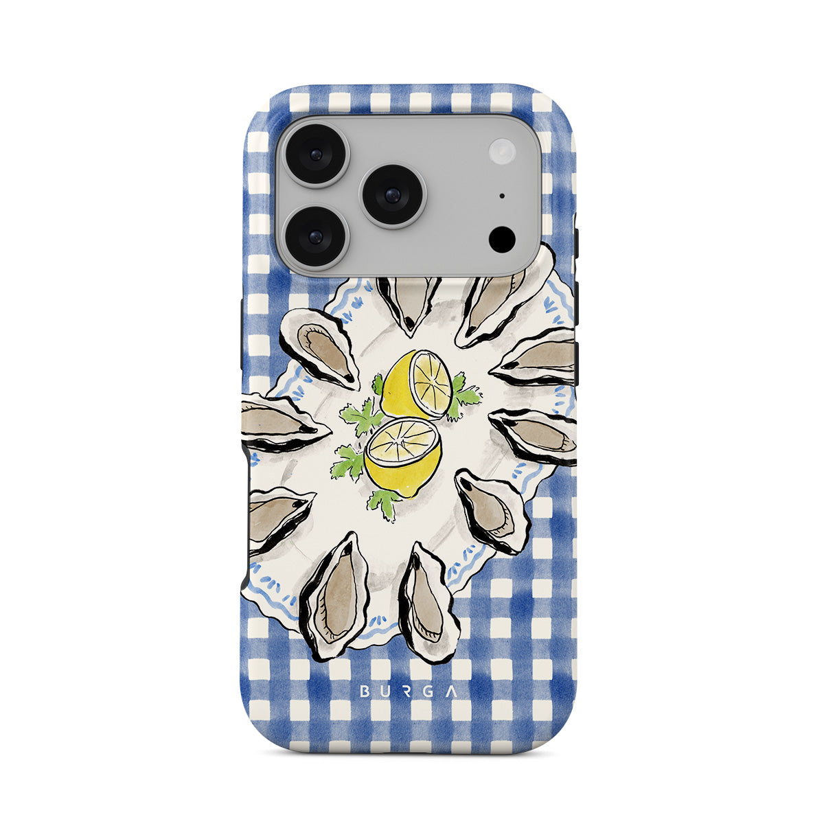 Este design contém:Ostras, limão, padrão xadrez azul, elementos costeiros frescos, tons suaves pastel.